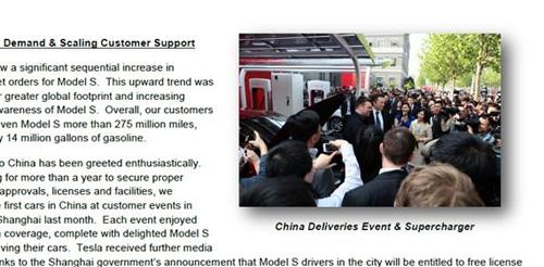 上个月,特斯拉在中国完成了首次交车。中国市场也成为了特斯拉未来发展的重要基石。在“致股东信”上,马斯克本人在北京交车的图片被放在了第一页的显著位置上。在问答环节中,马斯克表示中国人对特斯拉的热情超出了他的预期,全社会各个层面都对特斯拉显示出了极大的兴趣,马斯克也对特斯拉在中国的发展充满信心。不过他也意识到,现在急需解决的问题不是市场需求,而是如何减少车主的等待时间。目前特斯拉的周产量约为700辆。到2014年底,特斯拉希望将产能提升至1000辆/周。另外,今年特斯拉将着重渠道建设。到2014年底,特斯拉计划将门店及服务中心的数量同比提高75%。