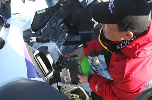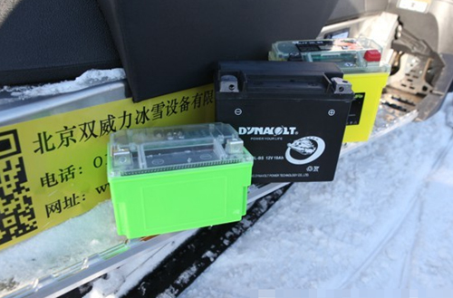 一个小时的时间很快过去,我们急切地取出了埋在雪中的电池,在李欣先生的协助下,我们把三块电池中实际容量最大的猛狮GHD20HL-BS电池连接到了一台600mL排量的庞巴迪(BRP)SKI-DOO雪地摩托车上。随着正负极连接妥当,激动人心的时刻也到来了:拧动钥匙门,发动机瞬间爆发出如虎啸般地轰鸣,猛狮电池一次性成功!但是吴总似乎还意犹未尽:关闭钥匙门、再次发动、再关闭、再发动……我们连续启动了多次,猛狮电池无一失手!