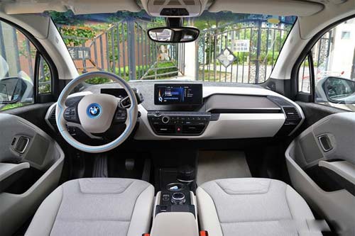 内饰方面,宝马i3内饰设计非常具有科技感,双辐式多功能方向盘造型独特,其仪表盘采用液晶显示屏设计。中控台造型简洁,中部的大尺寸独立液晶显示屏十分醒目。