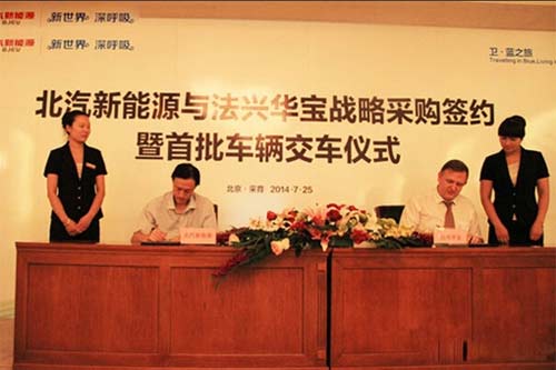 7月25日上午,北汽新能源与世界第二大汽车租赁公司法兴华宝签订采购签约暨首批车辆交付仪式。凭借过硬的产品实力和良好的口碑,北汽新能源成为法兴华宝中国区首个新能源汽车租赁业务供应商。此次交付的20辆E150EV纯电动车交车也是北汽新能源在国务院颁发《关于加快新能源汽车推广应用的指导意见》以来,大客户采购方面的第一笔订单,可以说是北汽新能源在汽车租赁市场探索的一个里程碑式事件。