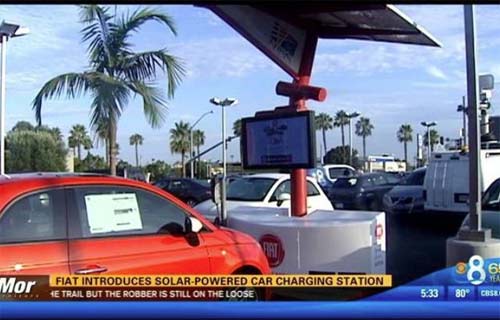 据美国媒体7月31日报道, 电动汽车最大的优点之一就是,如果有一个太阳能电池板或风力发电装置就可以利用自然免费充电。而菲亚特日前在圣迭戈(San Diego)停车场建设的太阳能充电站就可以做到这一点。