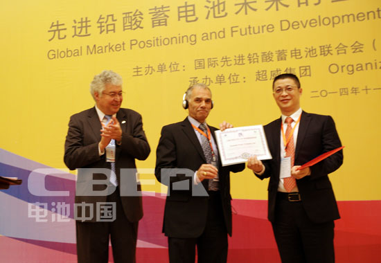 峰会上传来了捷报,超威集团加入了国际先进铅酸蓄电池联合会,成为该联合会的第十家中国成员单位。国际先进铅酸蓄电池联合会主席David Wilson(戴维•威尔森)向超威集团董事长周明明颁发了成员单位牌匾。
