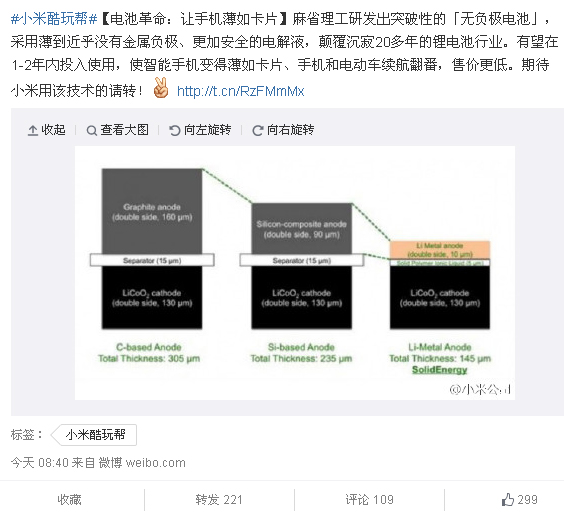 在今日更新的小米公司微博中,小米声称“麻省理工研发出突破性的‘无负极电池’,采用薄到近乎没有金属负极、更加安全的电解液,颠覆沉寂20多年的行业。有望在1-2年内投入使用,使智能手机变得薄如卡片……期待小米用该技术的请转!”