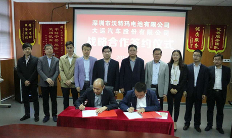 3月29日,山西大运汽车有限公司与深圳市沃特玛电池有限公司签定合作协议,双方计划2016年合作研发、生产65度电带EMT配置纯电动物流车1.5万台,并拟向沃特玛采购纯电动物流车电池系统15000组。