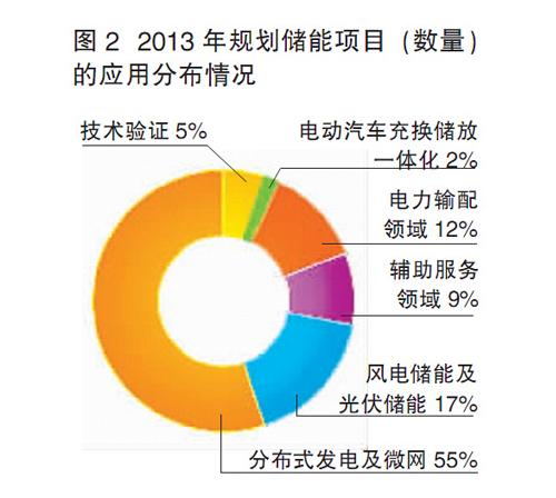 回顾2013年,储能产业继续保持增速式发展,新增投产运营项目28个,总装机近100MW,在建项目20个,预计装机88 MW。在政策、市场及技术进步等因素的推动下规划了储能项目42个,总装机142.6MW,涉及的应用领域包括分布式发电及微网、可再生能源并网、电力输配、辅助服务、电动汽车充换电等(图2)。其中分布式发电及微网项目中的储能系统主要应用于孤岛、军队、偏远地区(无电人口)、居民、工业、商业等领域,是2013年储能产业布局的热点。随着全球可再生能源的蓬勃发展,储能用于可再生能源接入、电力输配及辅助服务领域的节奏也在加快。