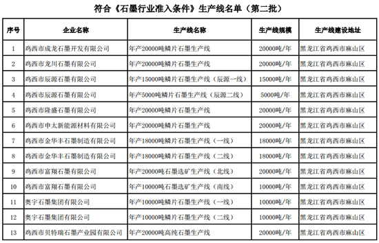 根据《石墨行业准入条件》和《石墨行业准入公告管理暂行办法》,经企业申报、省级工业和信息化主管部门核实、专家复核、网上公示和现场抽核,现将符合《石墨行业准入条件》生产线名单(第二批)予以公告。