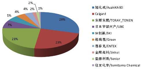 2008年全球前四大企业分别为日本旭化成、美国Celgard、日本东丽东燃、日本宇部兴产,占据82.8%的市场份额。随着国内厂商不断加大研发和投资力度,新增产能投入运行,出货量迅速增加,星源材质、佛山金辉高科、中科科技等大陆厂商实现隔膜产业化,其中星源材质已经与韩国LG化学、三星SDI、ATL、法国SAFT、松下能源、日本AESC等国际知名锂离子电池生产厂商开展深入合作,开始抢占全球市场份额。