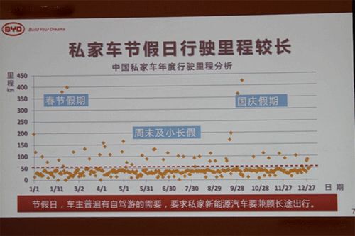 比亚迪传统汽油车的保有量差不多接近两百万台,根据这些汽车的统计数据也能测算出来,作为私家车来说,行使的里程从1月份到12月份,大部分集中在50公里以下,春节的时候可能会高一点。周末或者小长假,或者国庆假期高一点。绝大多数都是在50公里以下,王传福还给记者展示了统计数据的星状分布图。