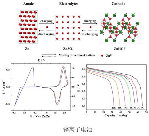 然而,低工作电压是目前制约新型水系离子电池发展的主要瓶颈之一。针对这一问题,中国科学院宁波材料技术与工程研究所动力工程实验室的科研人员在新型高电压水系离子电池探索方面取得了系列进展。该实验室继2013年首次提出锂钠混合离子电解质理念来构建新型水系离子电池,又扩展式提出了锂钾和钠钾混合离子电解质的新理念来构建水系离子电池。新电池的工作电压为1.45v,比能量达43whkg-1。在此基础上,实验室的科研人员还发现锌铁氰化络合物可作为锌离子电池正极材料,以金属锌为负极和锌铁氰化络合物为正极构建出一种新型高电压水系锌离子电池。其工作电压达到1.7v,为目前报道的现有水系离子电池的最高值之一。