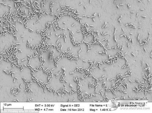 通过显微镜看到,海洋细菌希瓦氏菌的合成版本与碳电极发生互动