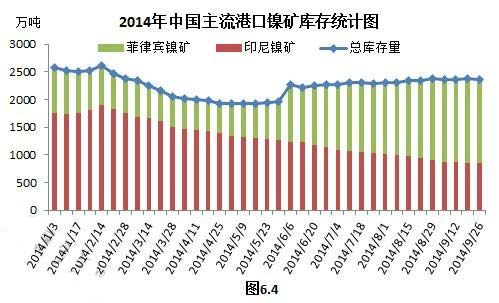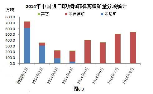 据海关数据统计,8月份中国镍矿进口总量为542万吨,比上月增加35万吨,同比增加17万吨;其中,从菲律宾进口量为532万吨,比上月增加32万吨,同比增加247万吨;从印尼进口量为3.8万吨,比上月增加0.3万吨,同比减少232万吨。相比6月份的359万吨、7月份的501万吨,8月菲律宾镍矿进口量可谓连连增加(图6.3)。