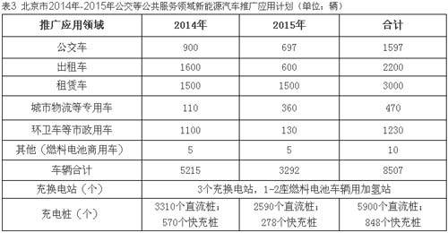 北京市计划到2015年底在公共领域推广应用新能源汽车8507辆,重点在公交、出租、租赁、货运物流、环卫等领域推广应用,在有条件的地区,推广机场内部、大型场站内部等领域使用新能源汽车,其中推广电动公交车1597辆、电动出租车2200辆、电动租赁车3000辆、电动物流车470辆、电动环卫车1230辆、燃料电池商用车10辆。建设充换电站3座,充电桩6748个,其中5900个交流充电桩、848个直流充电桩。
