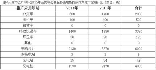 公交车:先期开展直充式公交车试验运行,同时开展插电式混合动力公交车试验运行,逐步扩大纯电动和插电式混合动力公交车投入力度,加快充换电站规划和建设,到2015年新能源公交车推广应用规模达到2000辆,其中,市区投入1500辆,滨海新区500辆。建设公交充换电站6座。