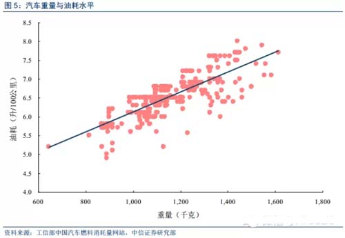 汽车轻量化对燃油效率提升的贡献明显。据工信部的油耗公告,按照不同车辆综合工况的油耗水平拟合结果为:汽车重量每降低100千克,可节约百公里油耗约0.28升。在实际使用中,相关研究显示:若汽车整车重量降低10%,燃油效率可提高6%-8%,减少二氧化碳排放约50克/公里;汽车整备质量每减少100千克,百公里油耗可降低0.3-0.6升。