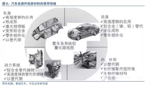 针对车身、动力系统及底盘系统的替代材料使用是目前最主要的轻量化手段。车身、动力及传动系统、底盘和悬挂系统是汽车整备质量上的三个最主要组成部分,分别约占整车质量的1/4左右。在保证功能和安全性的基础上,用密度更小的材料代替原有材料,是目前最有效的轻量化手段。例如,在汽车车身和底盘结构上,汽车厂商大量应用高强度钢等材料,在提高车身和底盘强度的同时降低了车身质量;发动机的制造利用轻质合金如镁、铝合金代替铸铁,减轻了发动机质量,同时获得了更好的发动机性能;绝大部分车型都开始将各种轻质材料引入汽车内外饰,既提升了汽车档次,又减少了内饰耗材和重量。