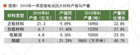 近日,高工锂电研究所从材料、电芯及下游产业等三部分分析了我国锂电行业2015年一季度的基本情况。从产值看,2015年第一季度中国材料产值规模达36.6亿元,同比增长9%,主要受益于汽车动力电池和储能电池。数码领域的手机(特别是高端手机)电池保持增长,平板、笔记本电池基本与去年同期持平。