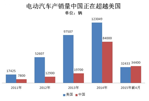 新能源汽车的全球竞争格局正在发生变化。多年占据第一大市场的美国,正在被中国超越:2015年前四个月,美国的插电车(包含纯电动和插电式混合动力)共销售3.24万辆。而中国工信部公布的同一时期产量显示,中国的新能源汽车总产量为3.44万辆,超越美国。