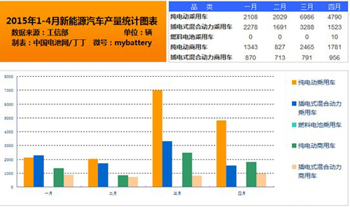 从全国各地的调研情况看,优质动力产品出现供不应求的局面,工信部最新的统计数据显示,2015年1-4月,我国新能源汽车累计生产3.44万辆,同比增长近3倍。其中,纯电动乘用车生产1.59万辆,同比增长近3倍,插电式混合动力乘用车生产8780辆,同比增长3倍;纯电动商用车生产6416辆,同比增长5倍,插电式混合动力商用车生产3330辆,同比增长70%。业内人士表示,受益于新能源汽车市场增量的强劲拉动,预计今年下半年动力市场供应仍趋紧,力神电池、国轩高科、ATL、创明电池、福斯特新能源集团、多氟多、沃特玛、比亚迪等产能释放加快,上游正极材料、负极材料、电解液、隔膜等四大材料增量明显。