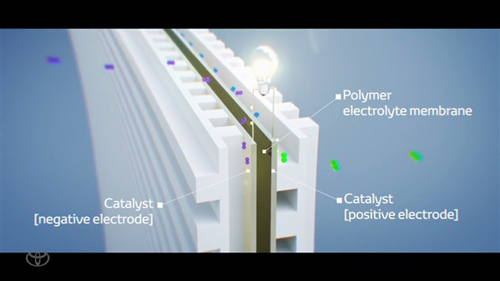 鉴于你可能并不了解燃料电池的原理,且容我简要介绍一下。燃料电池其实并不是烧氢气,而是让氢气经过含有催化剂的质子交换膜,在这里氢与外界吸入的氧结合,释放出电子。排出水蒸气。现在的技术已经可以做到以较低的价格,制作出可以长期使用的交换膜。按丰田自己的说法,现在的生产成本已经比他们刚涉足这领域研究时低了90%多。