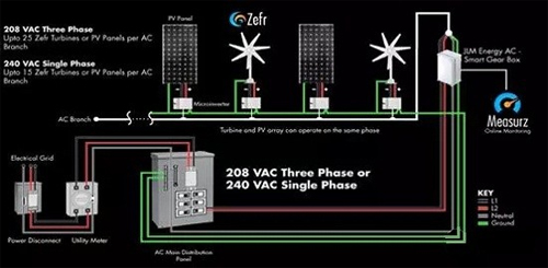 该风-光-电池离网家用系统采用风光互补技术进行供电,其中光伏发电采用JLM能源的Solarz产品,能够提供3种规格的光伏组件,并采用智能逆变器能远程实时监控发电状况;风力发电采用JLM能源的Zefr产品,这是一个结合空气动力学、电力电子和数字化控制的风阵列发电系统。