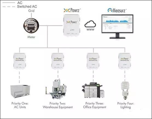 Powrz通过负荷接线箱与建筑物的电气负载相连,每个负荷接线箱只能连接到一个负载,负荷接线箱的载流能力可选,范围为60A~1200A之间可选。通过实时监测(一秒一次)建筑物的功率,Powrz可以获取实时功率需求。如果建筑物的总功率超过特定量,则Powrz将控制系统切断多达四个建筑物的负荷,一次一个,以减少高昂的电费支出。