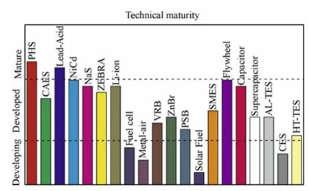 PHS- 抽水蓄能;CAES- 压缩空气;Lead-Acid: 铅酸电池;NiCd: 镍镉电池;NaS: 钠硫电池;ZEBRA: 镍氯电池;Li-ion: ;Fuel cell: 燃料电池;Metal-air: 金属空气电池;VRB: 液流电池;ZnbBr: 液流电池;PSB: 液流电池;Solar Fuel: 太阳能燃料电池;SMES: 超导储能;Flywheel: 飞轮; Capacitor/Supercapcitor: 电容/超级电容;AL-TES: 水/冰储热/冷系统;CES:低温储能系统;HT-TES:储热系统。