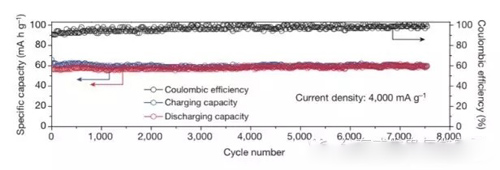这幅图展示了在铝电池7500次充放电的过程中所测得的充电容量,放电容量及库仑效率。充放电容量在7500次循环中没有减少的事实证明使用次数并不会造成电池容量的减少。电荷效率始终接近100%则证明电池中存储的电荷在放电时又出现了,并未在副反应或者其他过程中被消耗。