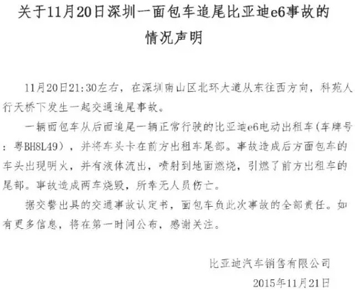就在事故发生后的第二天,11月21日,比亚迪在其官方微博发布关于11月20日深圳一面包车追尾比亚迪e6事故的情况声明,11月20日深圳科苑人行天桥下发生一起交通追尾事故。事故造成两车烧毁,所幸并未人员伤亡。据交警出具的交通事故认定书,面包车负此次交通事故的全部全责。