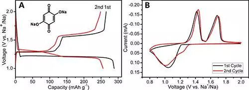 有机负极材料2,5苯醌-1,4二钠(Na2C6H2O4)的化学结构式和电化学性能