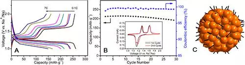 Na2C6H2O4/CNT纳米多孔复合材料的倍率性能、循环性能及结构示意图