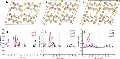 Na2C6H2O4(AD)、Na3C6H2O4(BE)和Na4C6H2O4(CF)的电荷密度图和电子态密度图