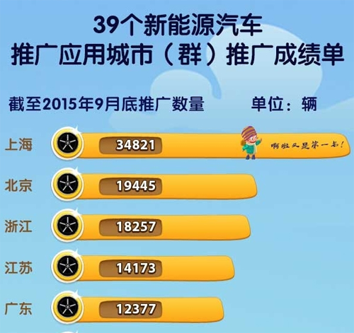 [摘要]39个新能源汽车推广应用城市(群)至2015年9月的推广成绩单公布,上海高居推广量和推广完成率榜首,北京名列第二。