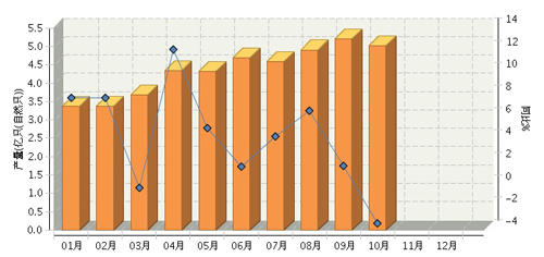 根据国家统计局公布数据,2015年1~10月,全国锂离子电池行业累计完成产量同比增长-2.19%。其中:10月份完成产量同比增长-3.4%。2015年全国锂离子电池行业月度产量及同比如上图所示。