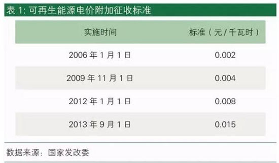 为了满足可再生能源电力发展,并且弥补可再生能源补贴拖欠,从2016年1月1日起,可再生能源电价附加征收标准从之前的1.5分/千瓦时提高到1.9分/千瓦时。这次发改委从颁布通知到开始正式执行仅两天之隔,一定程度上反映了增加附加满足补贴的紧迫性。这与我们关于电价附加会在近期上调的预测吻合,但实际增加的幅度却远远低于我们的预估。下面这篇分析给出了详细解释。