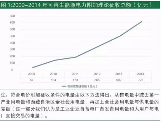中国支持以风电和太阳能发电为代表的可再生能源快速发展的主要补贴资金来自可再生能源发展基金,包括国家财政年度安排的专项资金和依法征收的可再生能源电价附加(之后简称“电价附加”)。