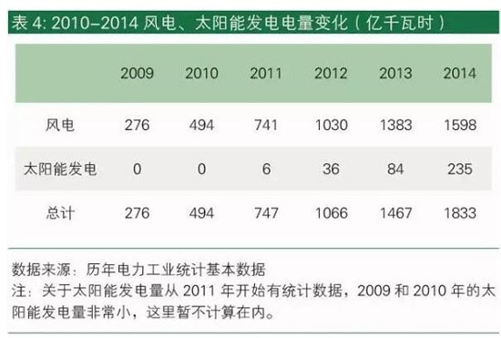 十二五期间,中国的可再生能源电力发展迅速。根据表4,风电和太阳能发电量从2010年的494亿千瓦时,增加到2014年的1833亿千瓦时,五年内增加了270%。根据表2所显示的补贴额,相应于发电量的增加,电价附加也应有相应幅度的增加,才能满足补贴的需要。