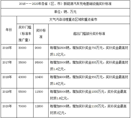 大气污染治理重点区域和重点省市(包括北京、上海、天津、河北、山西、江苏、浙江、山东、广东、海南),2016-2020年新能源汽车(标准车)推广数量分别不低于3.0万辆、3.5万辆、4.3万辆、5.5万辆、7万辆,且推广的新能源汽车数量占本地区新增及更新的汽车总量比例不低于2%、3%、4%、5%、6%。