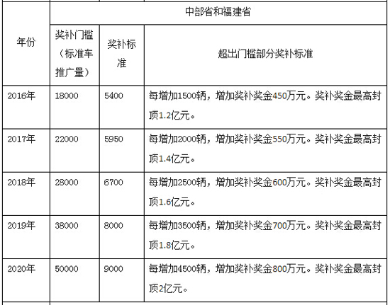 中部省(包括安徽、江西、河南、湖北、湖南)和福建省,2016-2020年新能源汽车(标准车)推广数量分别不低于1.8万辆、2.2万辆、2.8万辆、3.8万辆、5.0万辆,且推广的新能源汽车数量占本地区新增及更新的汽车总量比例不低于1.5%、2%、3%、4%、5%。
