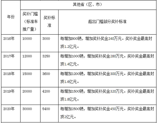其他省(区、市)2016-2020年新能源汽车(标准车)推广数量分别不低于1.0万辆、1.2万辆、1.5万辆、2.0万辆、3.0万辆,且推广的新能源汽车数量占本地区新增及更新的汽车总量比例不低于1%、1.5%、2%、2.5%、3%。