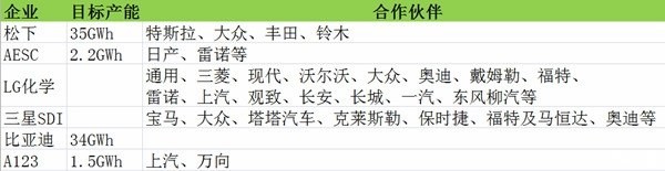 世界比较知名的电池制造商一般都集中在日、韩、中、美区域,除了上表提到的松下、AESC、LG等企业之外,还有江森自控、A123、PEVE(丰田与松下的合资公司)等。