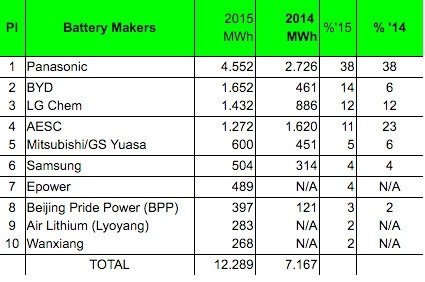 此外,中国还有几位实力型选手也进入前十排行,比如北京普莱德(Beijing Pride Bower)、洛阳Air Lithium(就是给康迪电动车提供心脏的公司)已及万向集团分列2015年排行榜的8、9、10位。