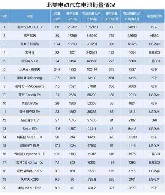 电动汽车将会是未来汽车发展的趋势之一,目前全球主流的汽车厂商都推出了相应的产品。2015年电动汽车全球销量仅有54.9万辆,相比传统汽车来说,电动汽车还有很大的增长空间。动力电池是电动汽车最重要的零部件,谁掌握了电池技术谁就能在电动汽车产业链中占据主动。最近北美网站公布了北美电动汽车(BEV纯电动/PHEV插电式混动)的销量情况,以及它们幕后的电池供应商。