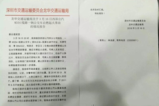 3月16日,深圳市交通运输委员会龙华交通运输局发布“关于3月16日西部公汽M354路一辆公交车自燃起火事故的情况报告”,报告指出,一辆M354路公交车在梅龙路四季春城公交站台车辆尾部冒烟,随后车辆起火自燃。事故没有造成人员伤亡。