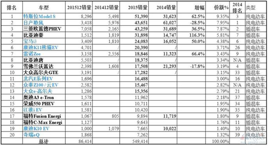]2015年全球最畅销电动汽车销量排名(TOP20):特斯拉Model S排名第一。