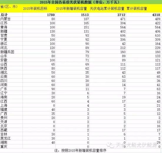 据统计,2015年我国太阳能光伏发电新增装机容量1374万千瓦,创历史新高,并连续三年新增装机超过1000万千瓦。其中,集中式光伏新增1320万千瓦,分布式光伏新增208万千瓦。江苏、内蒙古、青海、新疆2015年新增光伏装机容量超过100万千瓦。
